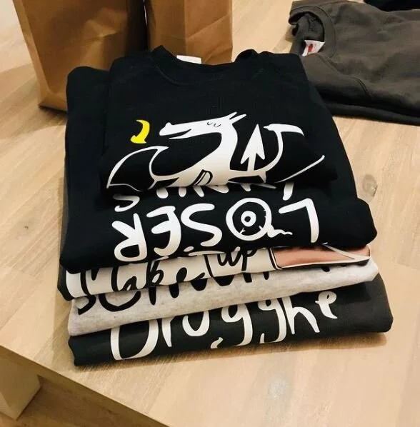 Wat vroeger “hishers wupshopje” was, is uitgegroeid tot één van de pijlers van deze website. De tekeningen en handgeschreven teksten sierden al menig stukje stof in het straatbeeld, en bijna iedereen komt terug om meer. Méér babybody’s in de stijl van het geboortekaartje, méér one-of-a-kind babyslabbetjes en méér gepersonaliseerde truien. We begrijpen het, hoor. Welkom terug.